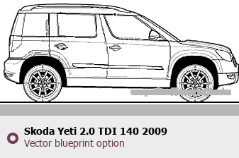 Raster blueprint of the 2009 Skoda Yeti 2.0 TDI 140 SUV. This free downloadable image can be used for graphic projects, digital design, and 3D modeling. The file provides accurate exterior proportions of the vehicle. Model year: 2009. Body type: SUV.