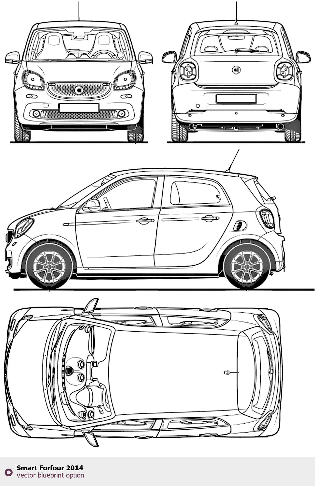Raster blueprint of the 2014 Smart Forfour Hatchback. This free downloadable image can be used for graphic projects, digital design, and 3D modeling. The file provides accurate exterior proportions of the vehicle. Model year: 2014. Body type: Hatchback.