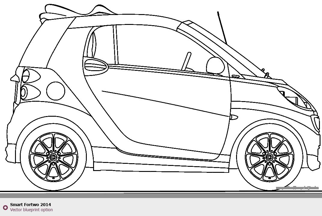 Raster blueprint of the 2014 Smart Fortwo Hatchback. This free downloadable image can be used for graphic projects, digital design, and 3D modeling. The file provides accurate exterior proportions of the vehicle. Model year: 2014. Body type: Hatchback.