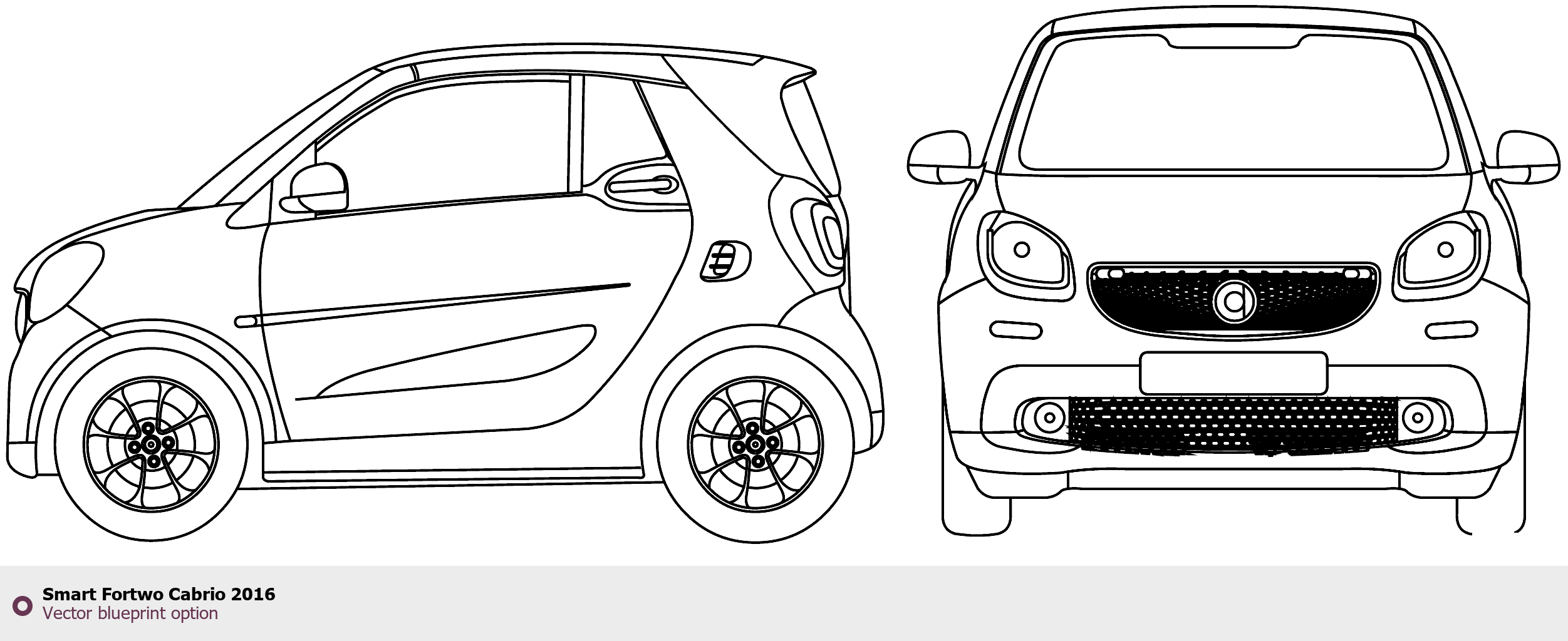 Raster blueprint of the 2016 Smart Fortwo Cabrio Cabriolet. This free downloadable image can be used for graphic projects, digital design, and 3D modeling. The file provides accurate exterior proportions of the vehicle. Model year: 2016. Body type: Cabriolet.