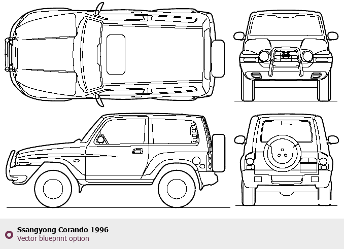 Raster blueprint of the 1996 SsangYong Corando Tag. This free downloadable image can be used for graphic projects, digital design, and 3D modeling. The file provides accurate exterior proportions of the vehicle. Model year: 1996. Body type: Tag.