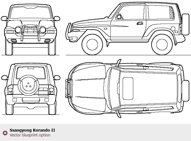 Raster blueprint of the SsangYong Korando II Tag. This free downloadable image can be used for graphic projects, digital design, and 3D modeling. The file provides accurate exterior proportions of the vehicle. Body type: Tag.