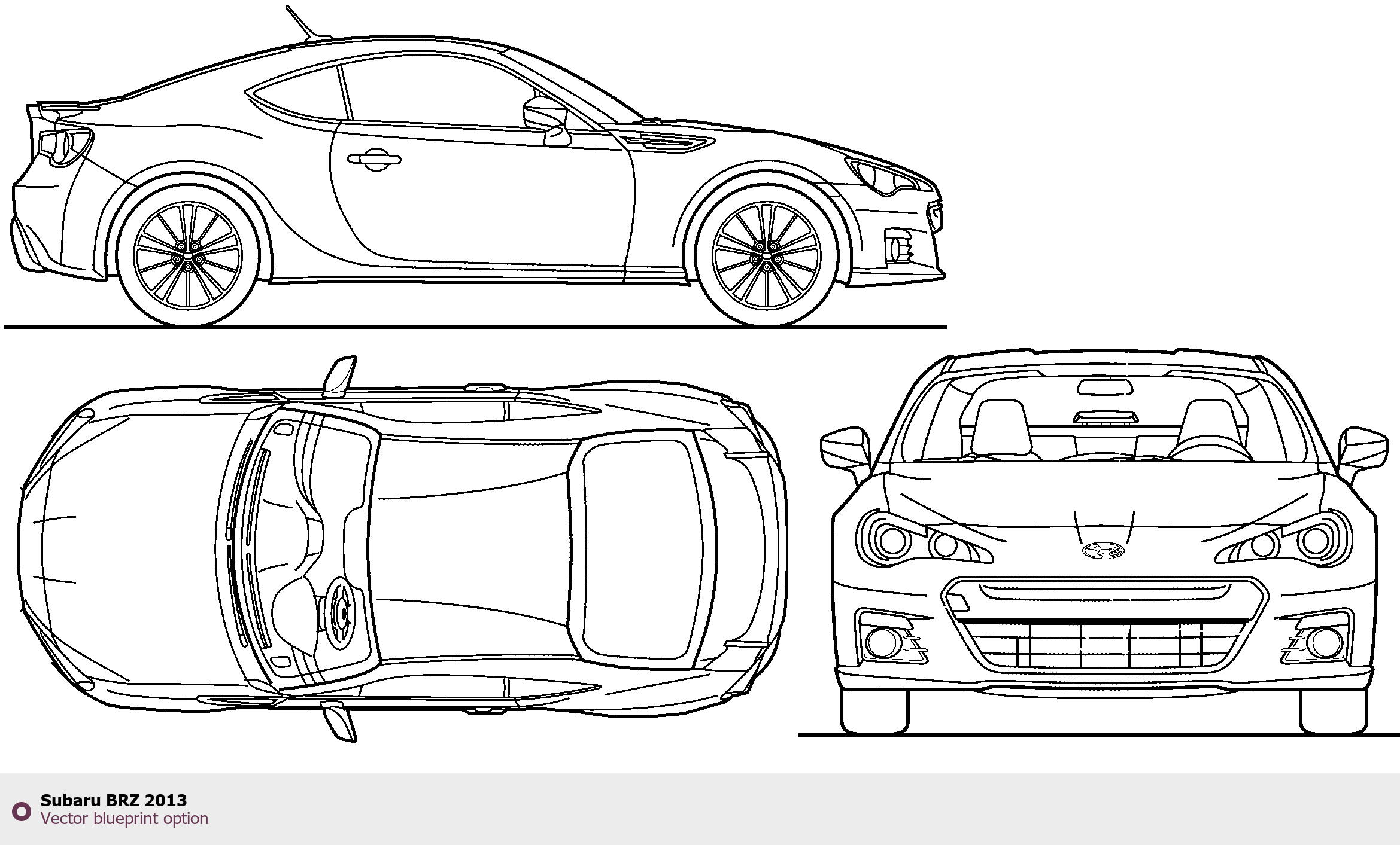 Raster blueprint of the 2013 Subaru BRZ Coupe. This free downloadable image can be used for graphic projects, digital design, and 3D modeling. The file provides accurate exterior proportions of the vehicle. Model year: 2013. Body type: Coupe.