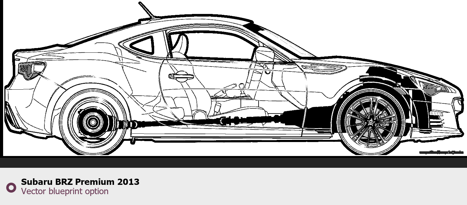 Raster blueprint of the 2013 Subaru BRZ Premium Coupe. This free downloadable image can be used for graphic projects, digital design, and 3D modeling. The file provides accurate exterior proportions of the vehicle. Model year: 2013. Body type: Coupe.
