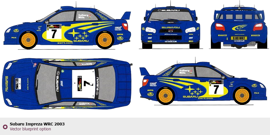 Raster blueprint of the 2003 Subaru Impreza WRC Sedan. This free downloadable image can be used for graphic projects, digital design, and 3D modeling. The file provides accurate exterior proportions of the vehicle. Model year: 2003. Body type: Sedan.