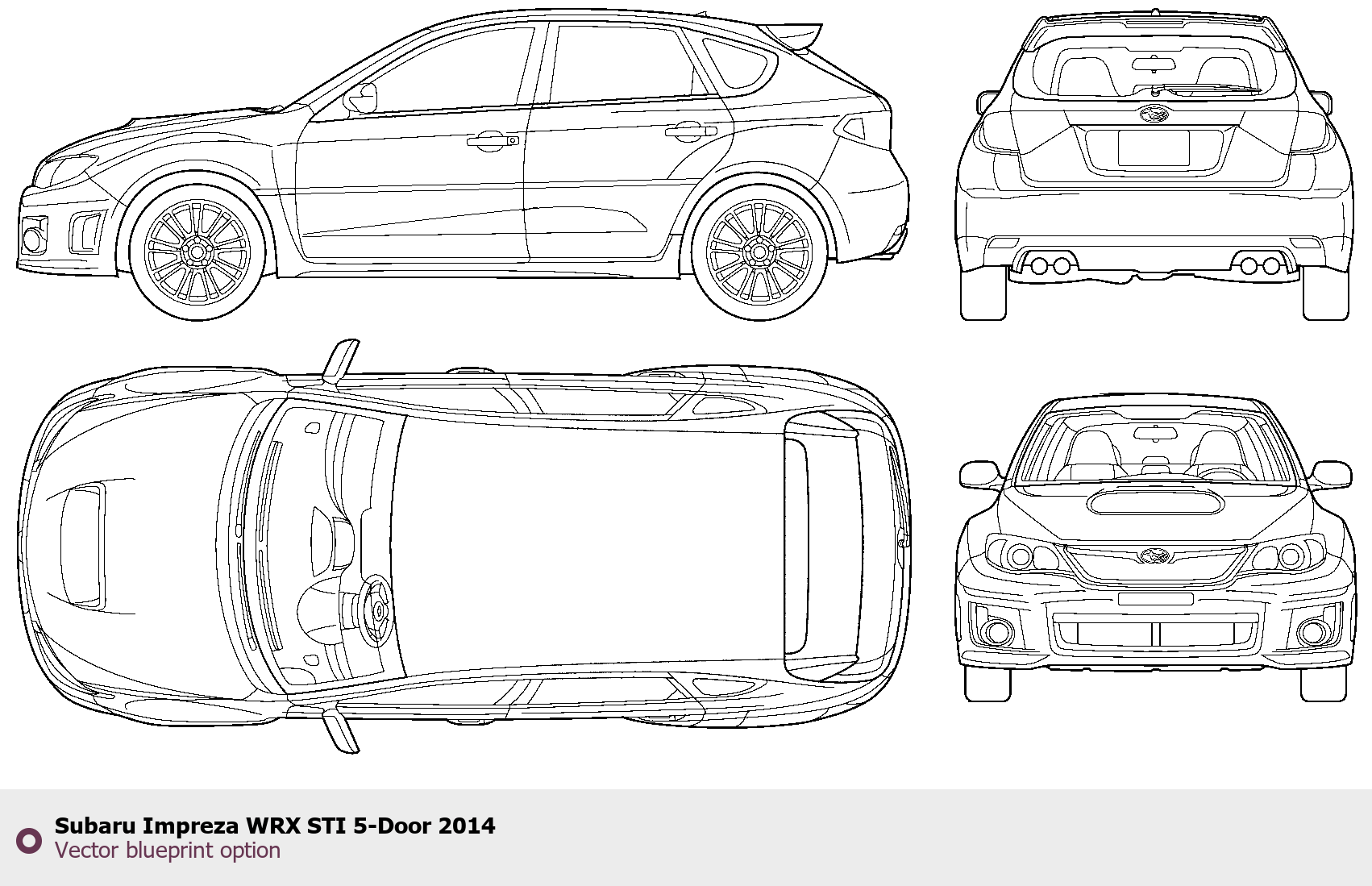 Raster blueprint of the 2014 Subaru Impreza WRX STI 5-Door Tag. This free downloadable image can be used for graphic projects, digital design, and 3D modeling. The file provides accurate exterior proportions of the vehicle. Model year: 2014. Body type: Tag.