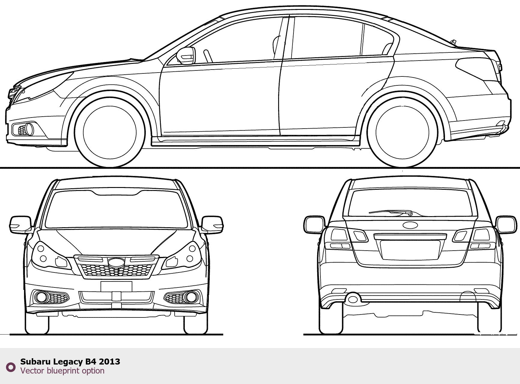 Raster blueprint of the 2013 Subaru Legacy B4 Tag. This free downloadable image can be used for graphic projects, digital design, and 3D modeling. The file provides accurate exterior proportions of the vehicle. Model year: 2013. Body type: Tag.