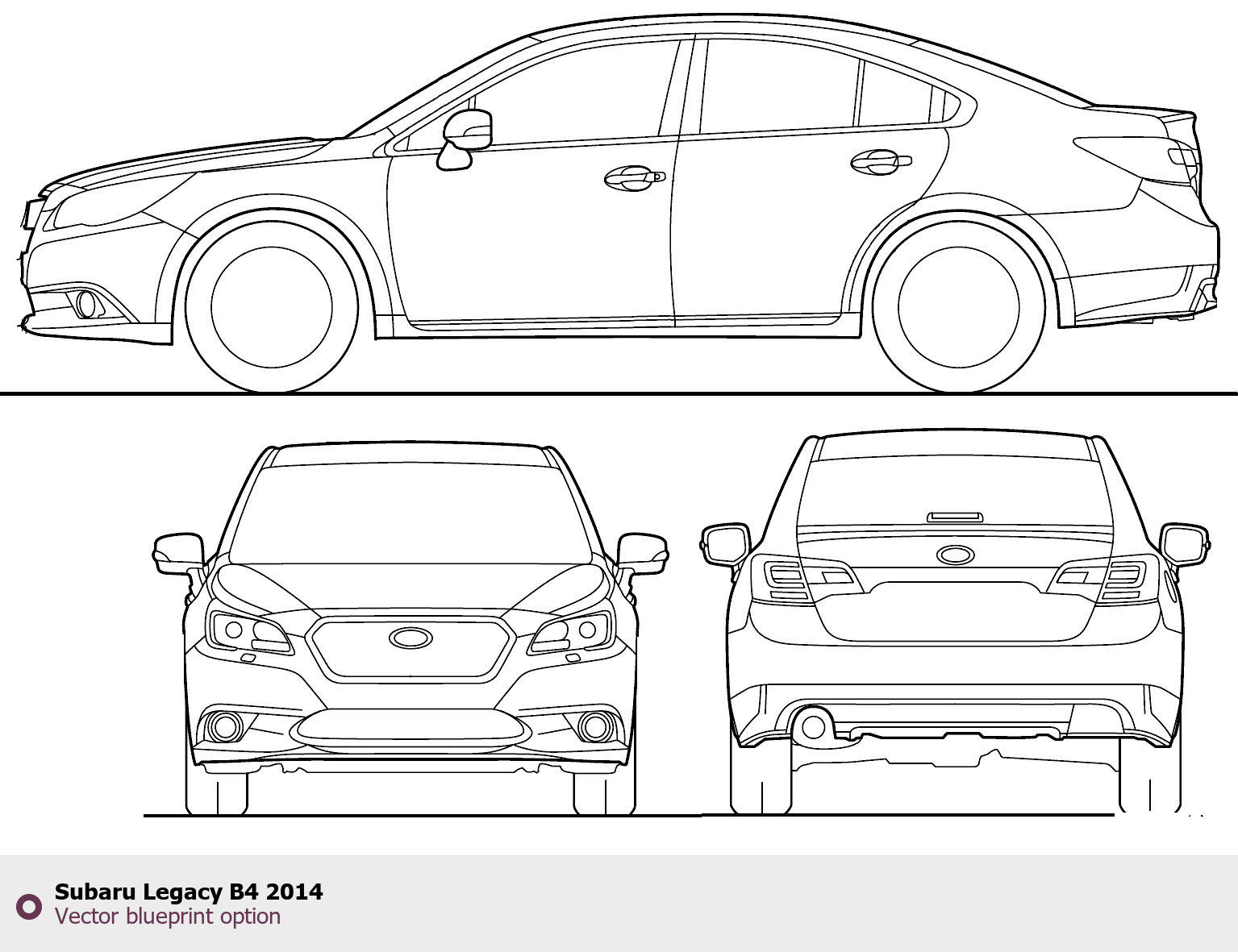 Raster blueprint of the 2014 Subaru Legacy B4 Tag. This free downloadable image can be used for graphic projects, digital design, and 3D modeling. The file provides accurate exterior proportions of the vehicle. Model year: 2014. Body type: Tag.