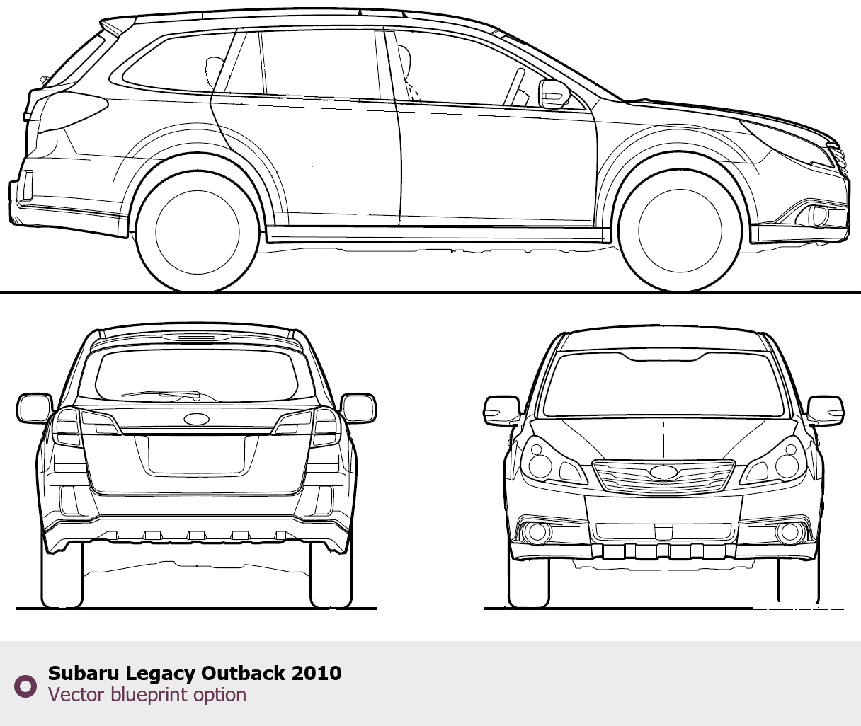 Raster blueprint of the 2010 Subaru Legacy Outback SUV. This free downloadable image can be used for graphic projects, digital design, and 3D modeling. The file provides accurate exterior proportions of the vehicle. Model year: 2010. Body type: SUV.