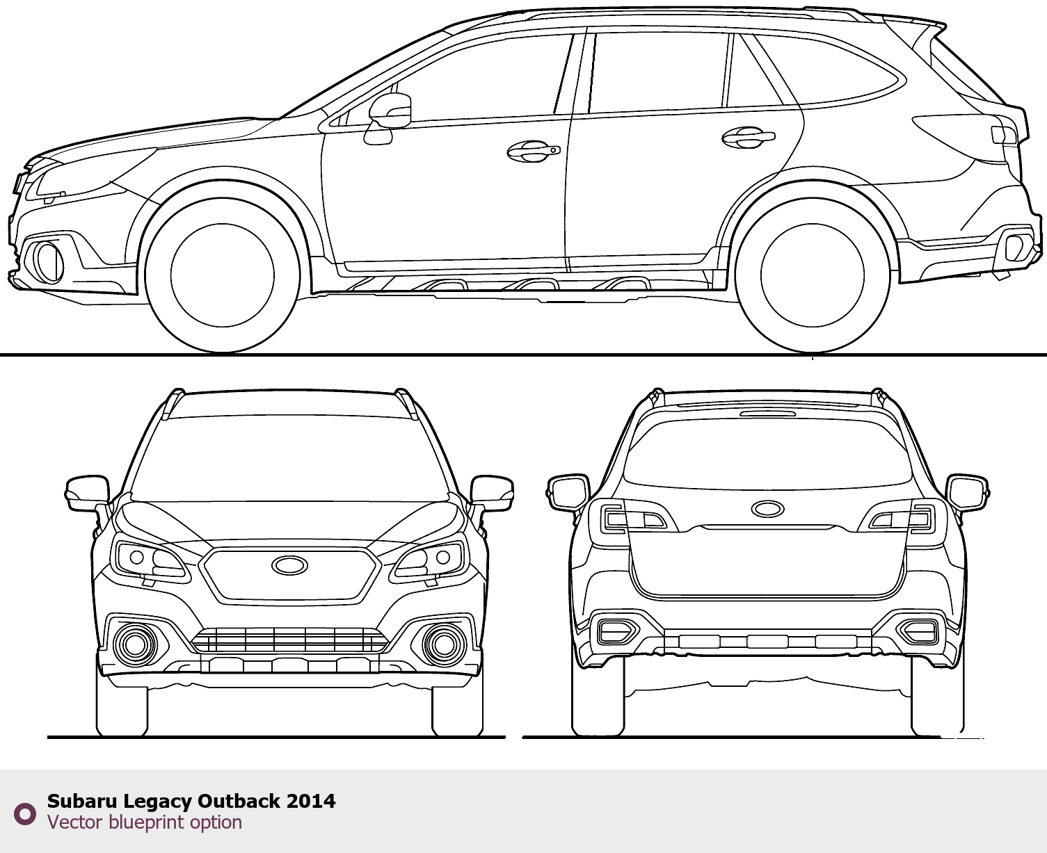 Raster blueprint of the 2014 Subaru Legacy Outback SUV. This free downloadable image can be used for graphic projects, digital design, and 3D modeling. The file provides accurate exterior proportions of the vehicle. Model year: 2014. Body type: SUV.