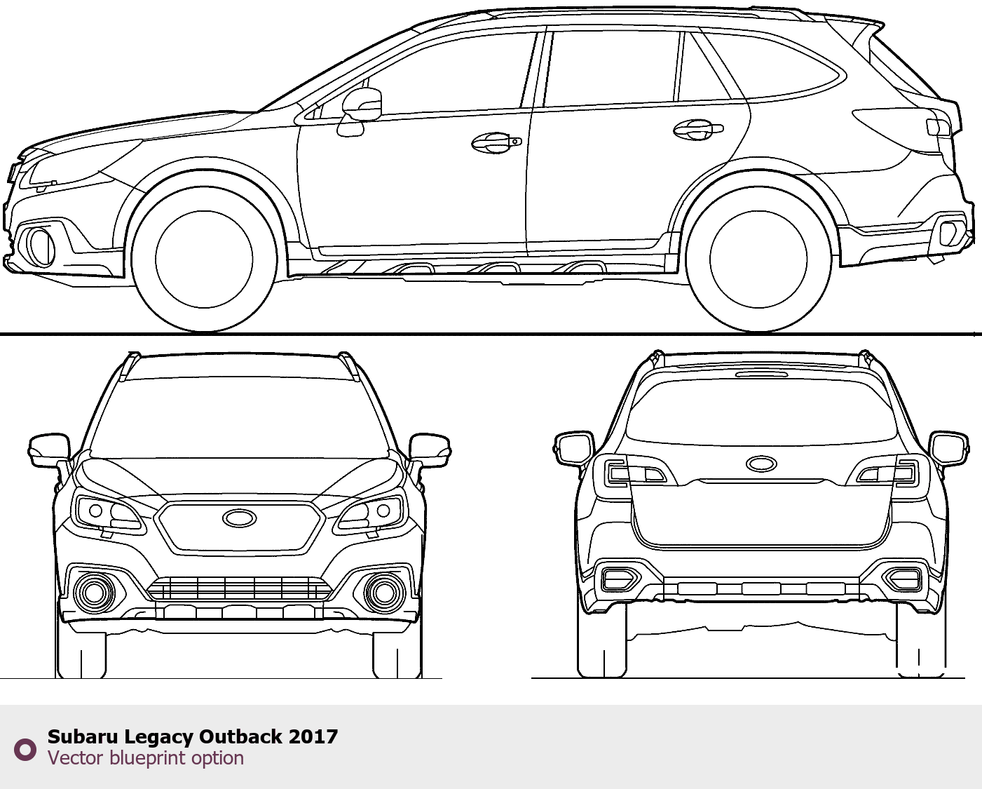 Raster blueprint of the 2017 Subaru Legacy Outback SUV. This free downloadable image can be used for graphic projects, digital design, and 3D modeling. The file provides accurate exterior proportions of the vehicle. Model year: 2017. Body type: SUV.