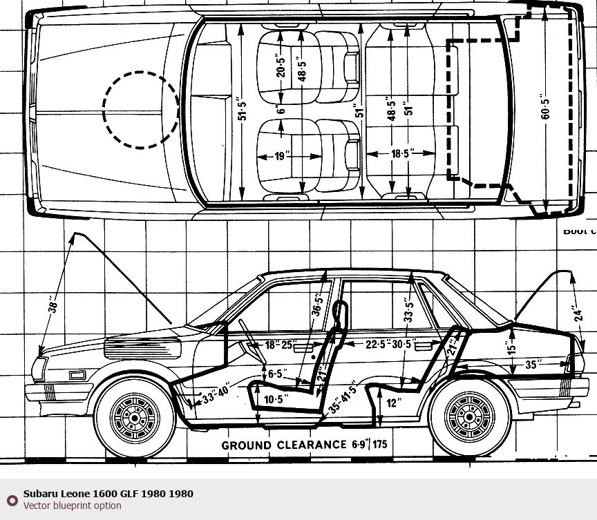 Raster blueprint of the 1980 Subaru Leone 1600 GLF 1980 Tag. This free downloadable image can be used for graphic projects, digital design, and 3D modeling. The file provides accurate exterior proportions of the vehicle. Model year: 1980. Body type: Tag.
