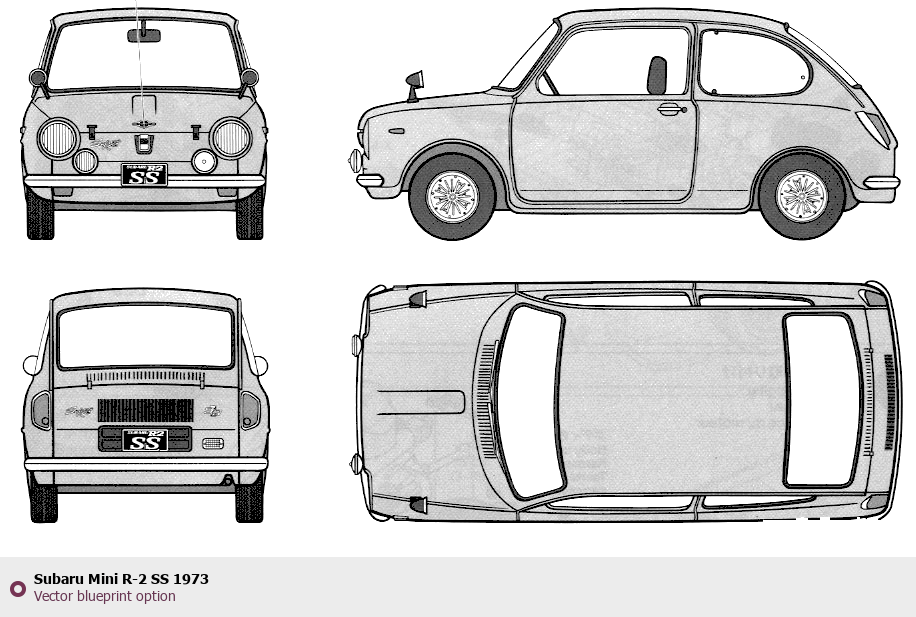 Raster blueprint of the 1973 Subaru Mini R-2 SS Tag. This free downloadable image can be used for graphic projects, digital design, and 3D modeling. The file provides accurate exterior proportions of the vehicle. Model year: 1973. Body type: Tag.