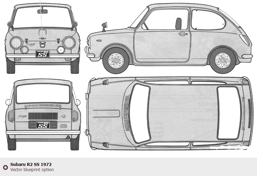 Raster blueprint of the 1972 Subaru R2 SS Hatchback. This free downloadable image can be used for graphic projects, digital design, and 3D modeling. The file provides accurate exterior proportions of the vehicle. Model year: 1972. Body type: Hatchback.