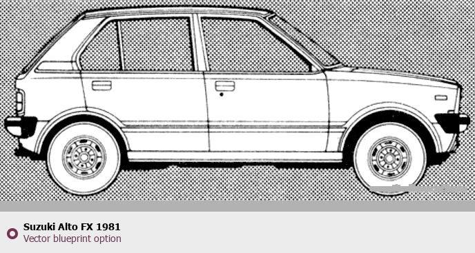Raster blueprint of the 1981 Suzuki Alto FX Hatchback. This free downloadable image can be used for graphic projects, digital design, and 3D modeling. The file provides accurate exterior proportions of the vehicle. Model year: 1981. Body type: Hatchback.