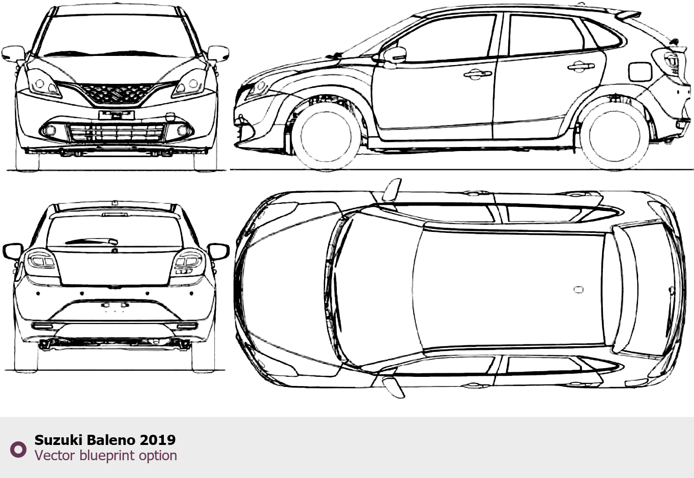 Raster blueprint of the 2019 Suzuki Baleno Tag. This free downloadable image can be used for graphic projects, digital design, and 3D modeling. The file provides accurate exterior proportions of the vehicle. Model year: 2019. Body type: Tag.