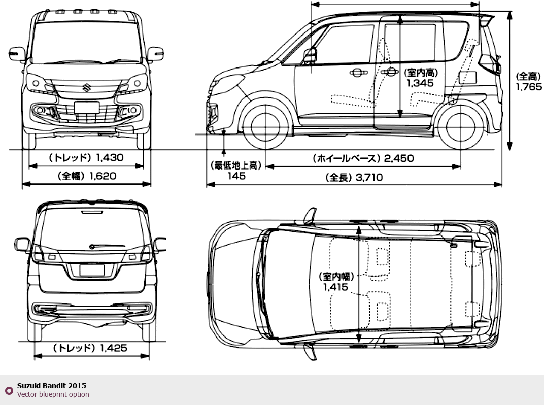 Raster blueprint of the 2015 Suzuki Bandit Tag. This free downloadable image can be used for graphic projects, digital design, and 3D modeling. The file provides accurate exterior proportions of the vehicle. Model year: 2015. Body type: Tag.