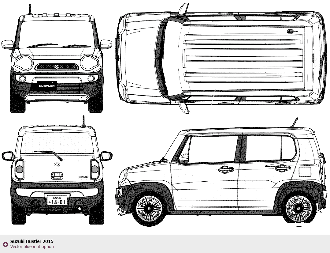Raster blueprint of the 2015 Suzuki Hustler Hatchback. This free downloadable image can be used for graphic projects, digital design, and 3D modeling. The file provides accurate exterior proportions of the vehicle. Model year: 2015. Body type: Hatchback.