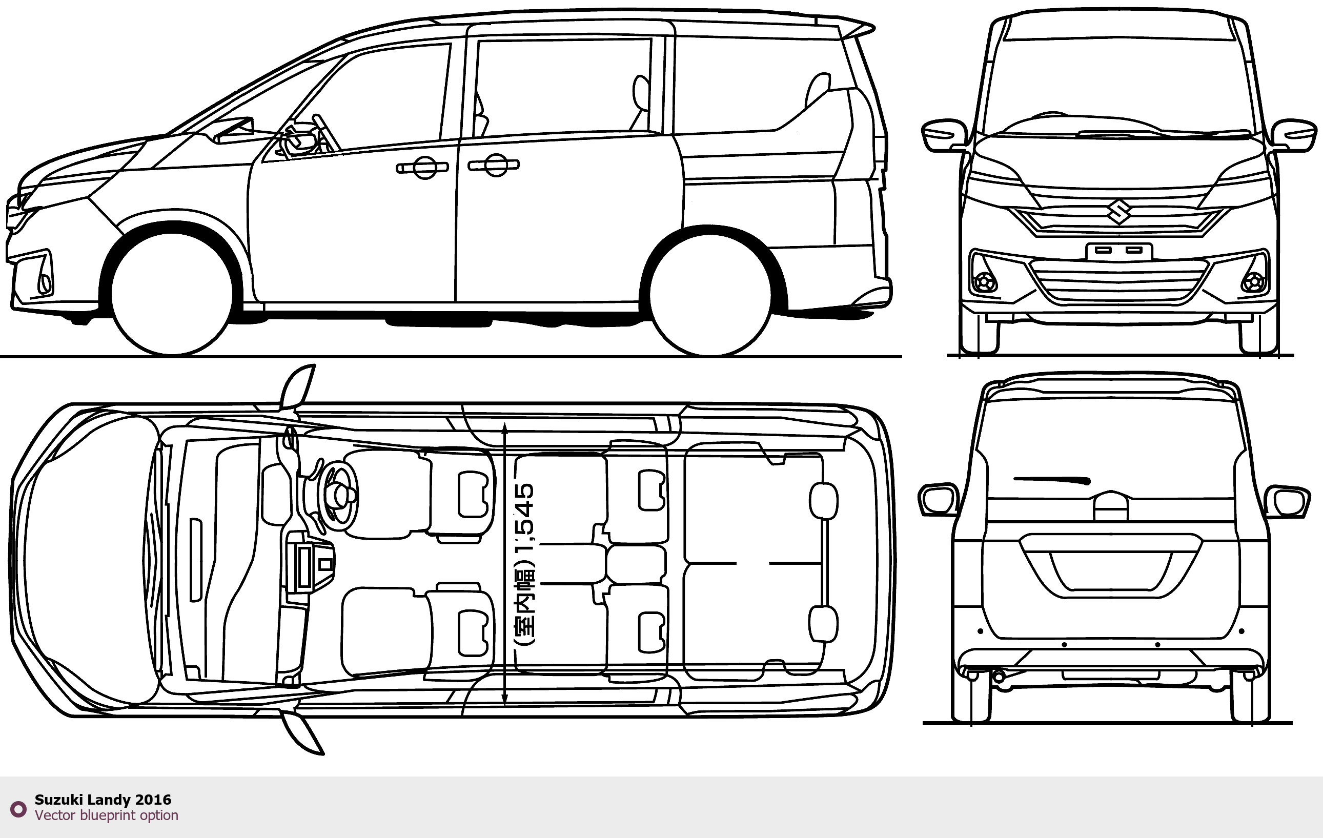 Raster blueprint of the 2016 Suzuki Landy Minivan. This free downloadable image can be used for graphic projects, digital design, and 3D modeling. The file provides accurate exterior proportions of the vehicle. Model year: 2016. Body type: Minivan.