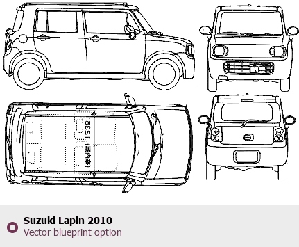 Raster blueprint of the 2010 Suzuki Lapin Tag. This free downloadable image can be used for graphic projects, digital design, and 3D modeling. The file provides accurate exterior proportions of the vehicle. Model year: 2010. Body type: Tag.