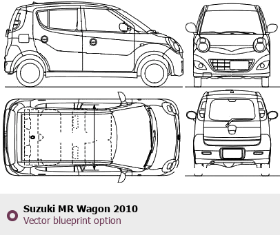 Raster blueprint of the 2010 Suzuki MR Wagon Microvan. This free downloadable image can be used for graphic projects, digital design, and 3D modeling. The file provides accurate exterior proportions of the vehicle. Model year: 2010. Body type: Microvan.