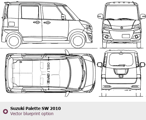 Raster blueprint of the 2010 Suzuki Palette SW Microvan. This free downloadable image can be used for graphic projects, digital design, and 3D modeling. The file provides accurate exterior proportions of the vehicle. Model year: 2010. Body type: Microvan.