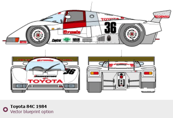 Raster blueprint of the 1984 Toyota 84C Tag. This free downloadable image can be used for graphic projects, digital design, and 3D modeling. The file provides accurate exterior proportions of the vehicle. Model year: 1984. Body type: Tag.