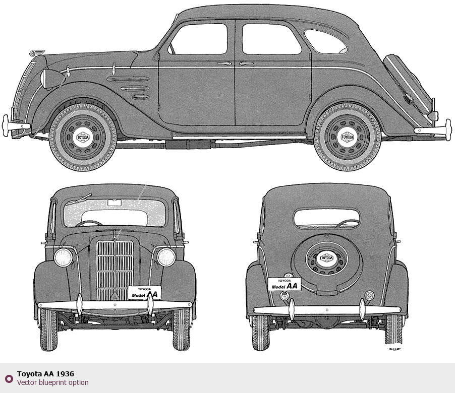 Raster blueprint of the 1936 Toyota AA Tag. This free downloadable image can be used for graphic projects, digital design, and 3D modeling. The file provides accurate exterior proportions of the vehicle. Model year: 1936. Body type: Tag.