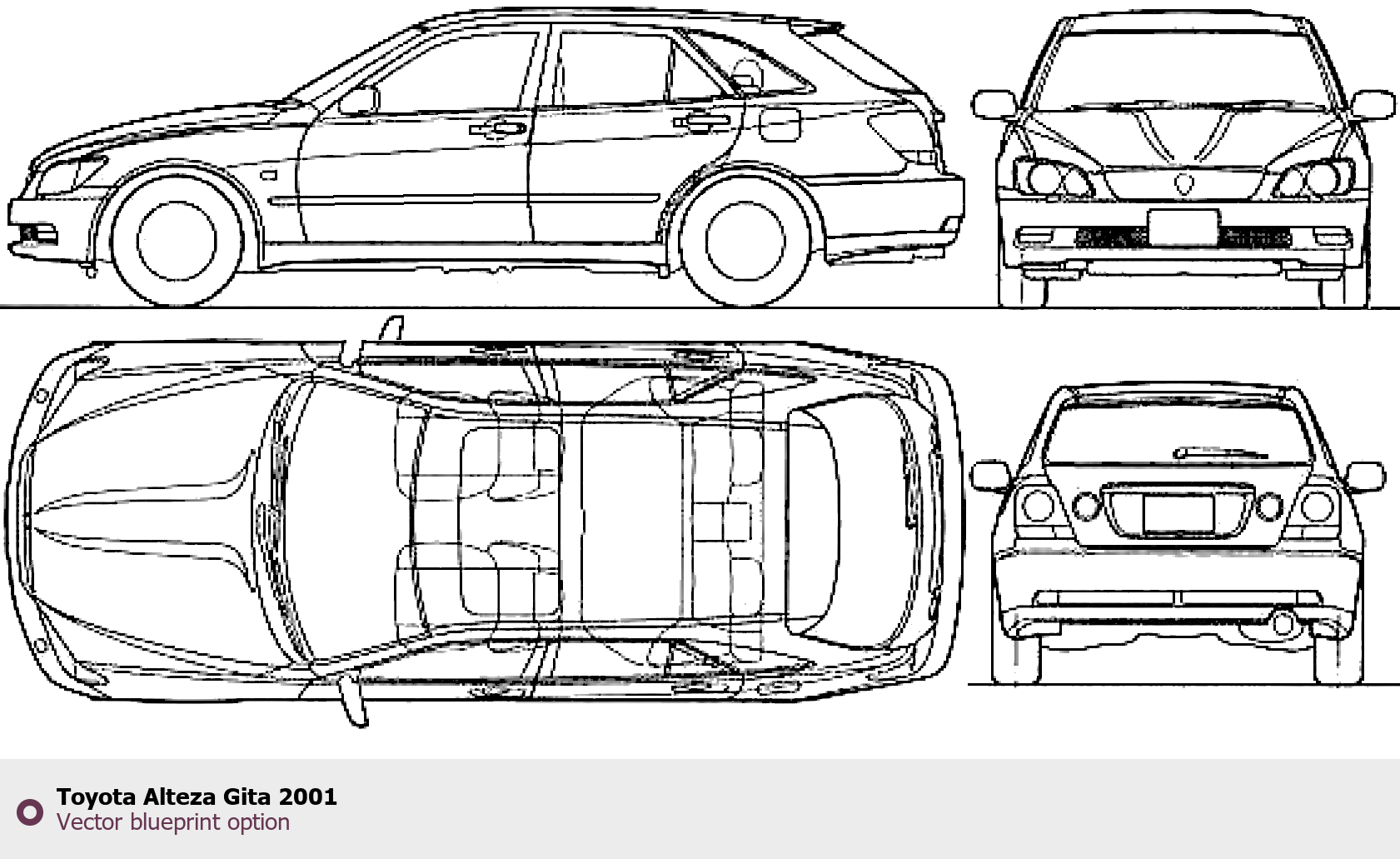 Raster blueprint of the 2001 Toyota Alteza Gita Tag. This free downloadable image can be used for graphic projects, digital design, and 3D modeling. The file provides accurate exterior proportions of the vehicle. Model year: 2001. Body type: Tag.