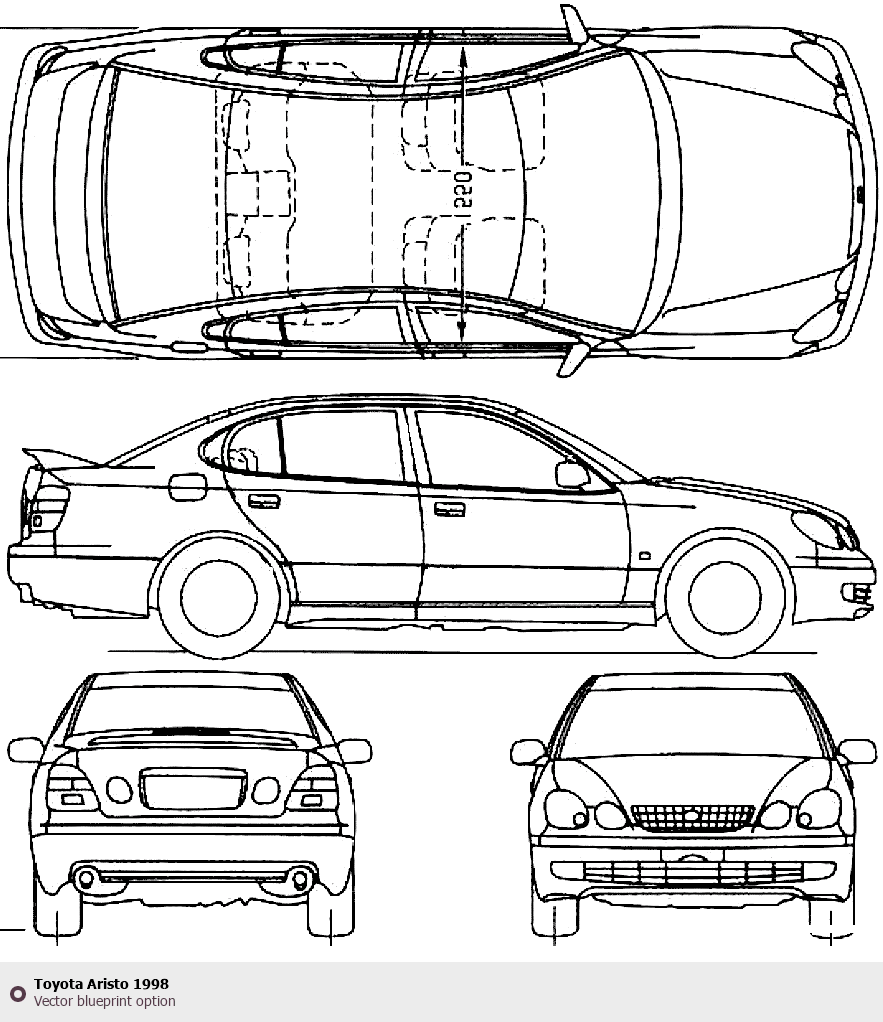 Raster blueprint of the 1998 Toyota Aristo Sedan. This free downloadable image can be used for graphic projects, digital design, and 3D modeling. The file provides accurate exterior proportions of the vehicle. Model year: 1998. Body type: Sedan.