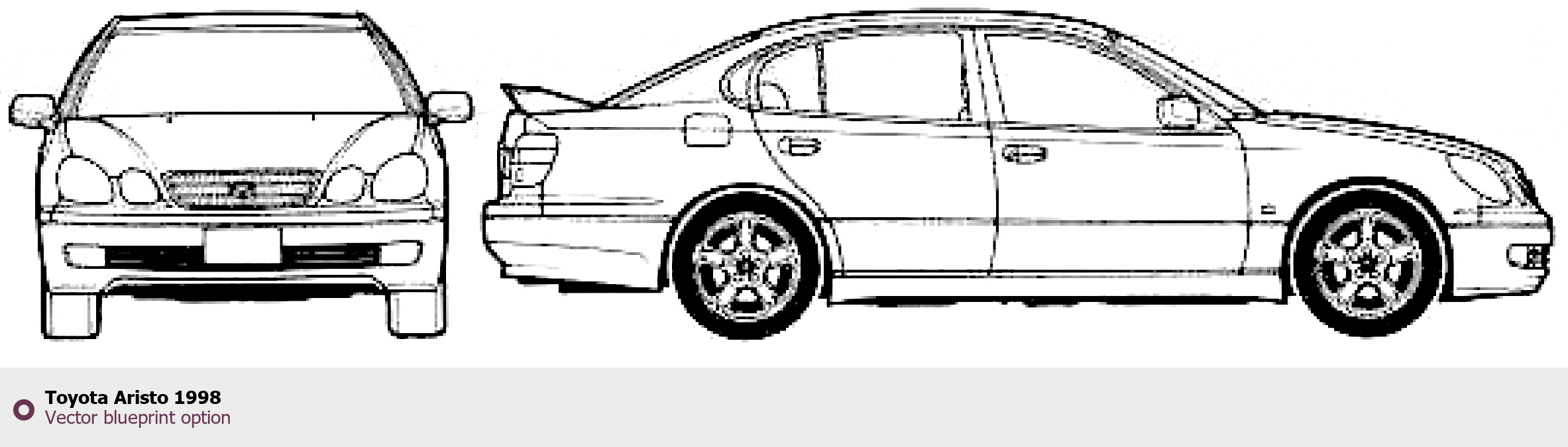 Raster blueprint of the 1998 Toyota Aristo Sedan. This free downloadable image can be used for graphic projects, digital design, and 3D modeling. The file provides accurate exterior proportions of the vehicle. Model year: 1998. Body type: Sedan.