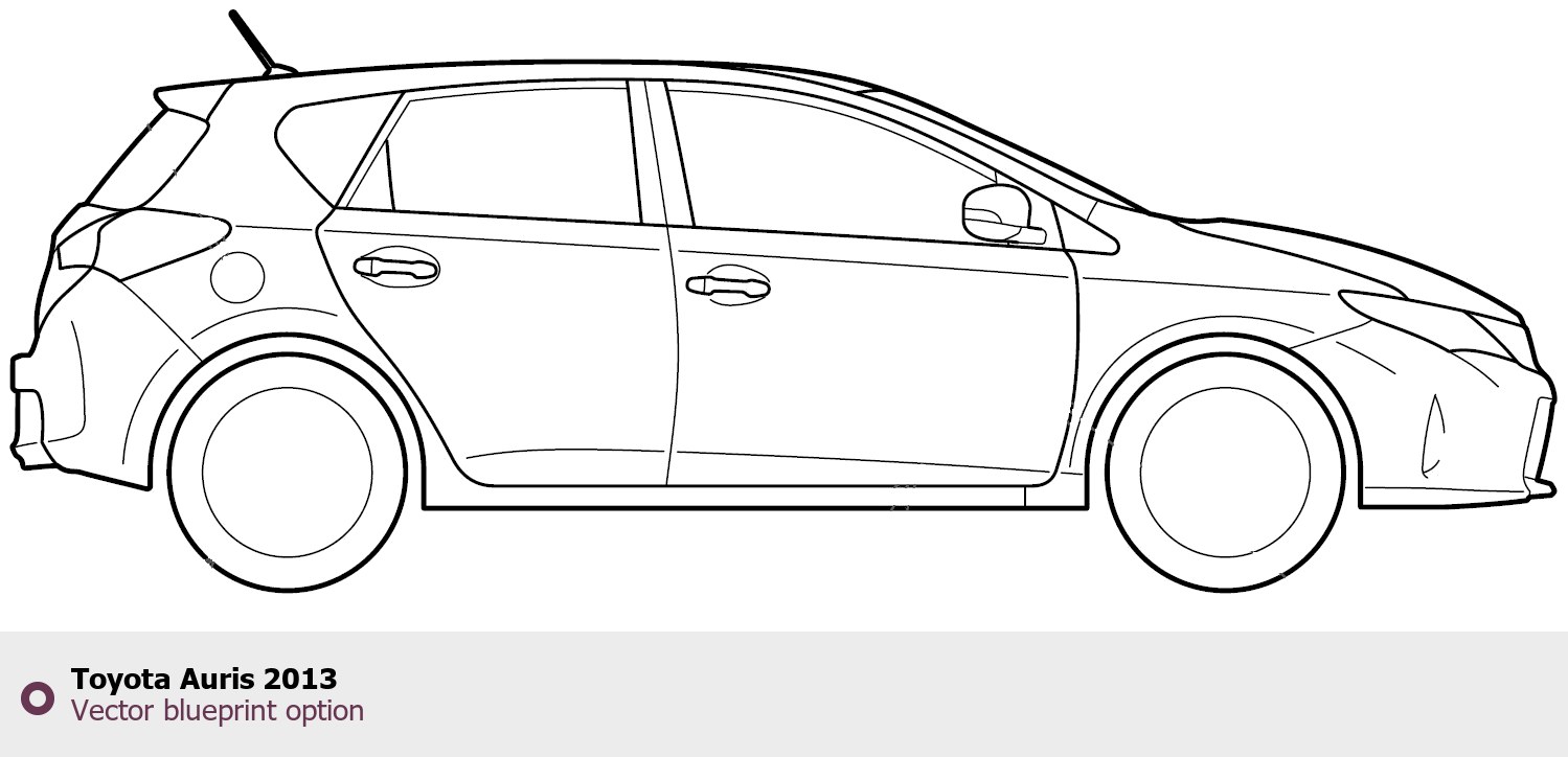 Raster blueprint of the 2013 Toyota Auris Tag. This free downloadable image can be used for graphic projects, digital design, and 3D modeling. The file provides accurate exterior proportions of the vehicle. Model year: 2013. Body type: Tag.