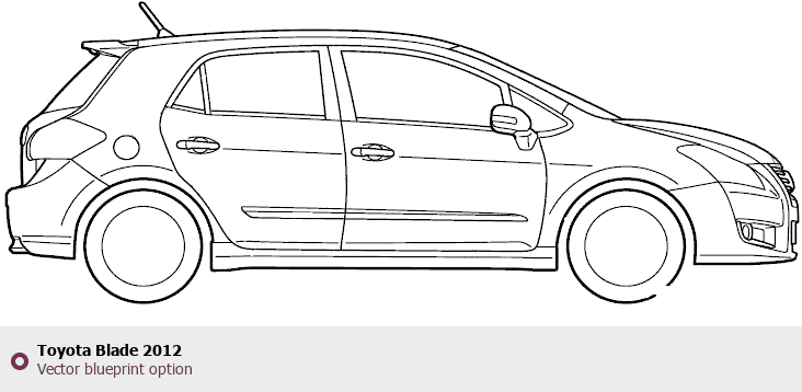Raster blueprint of the 2012 Toyota Blade Hatchback. This free downloadable image can be used for graphic projects, digital design, and 3D modeling. The file provides accurate exterior proportions of the vehicle. Model year: 2012. Body type: Hatchback.
