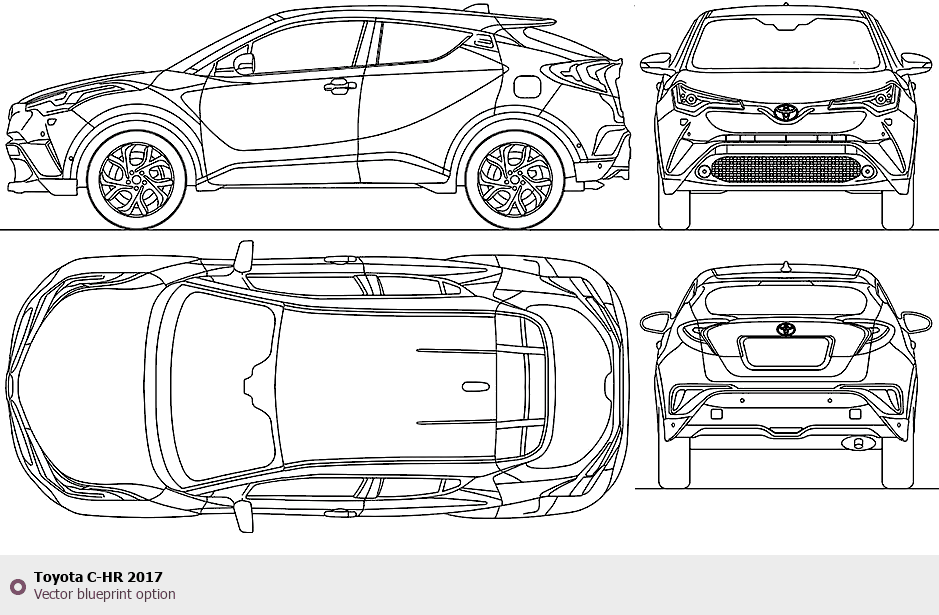 Raster blueprint of the 2017 Toyota C-HR SUV. This free downloadable image can be used for graphic projects, digital design, and 3D modeling. The file provides accurate exterior proportions of the vehicle. Model year: 2017. Body type: SUV.