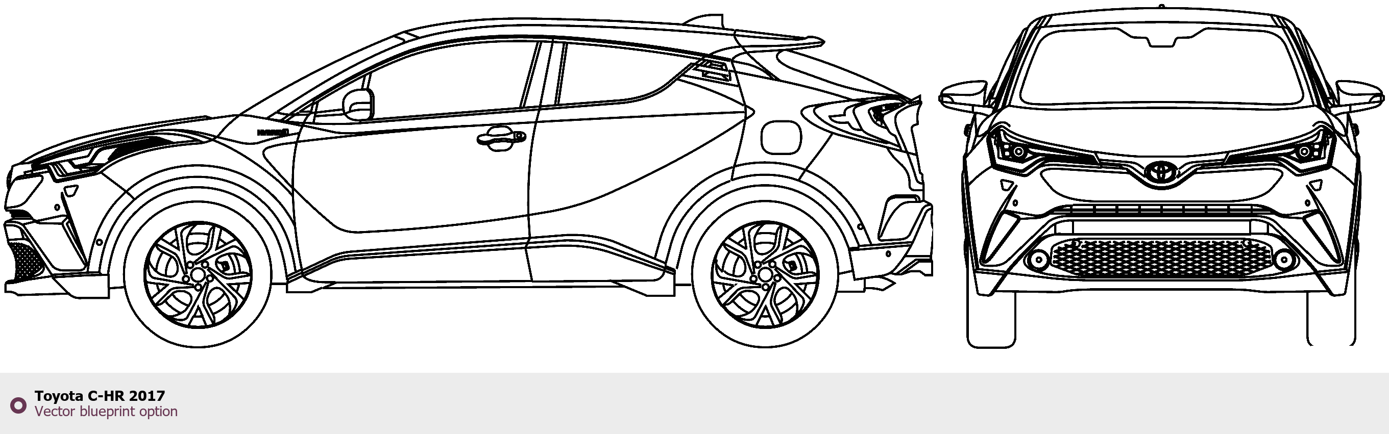 Raster blueprint of the 2017 Toyota C-HR SUV. This free downloadable image can be used for graphic projects, digital design, and 3D modeling. The file provides accurate exterior proportions of the vehicle. Model year: 2017. Body type: SUV.