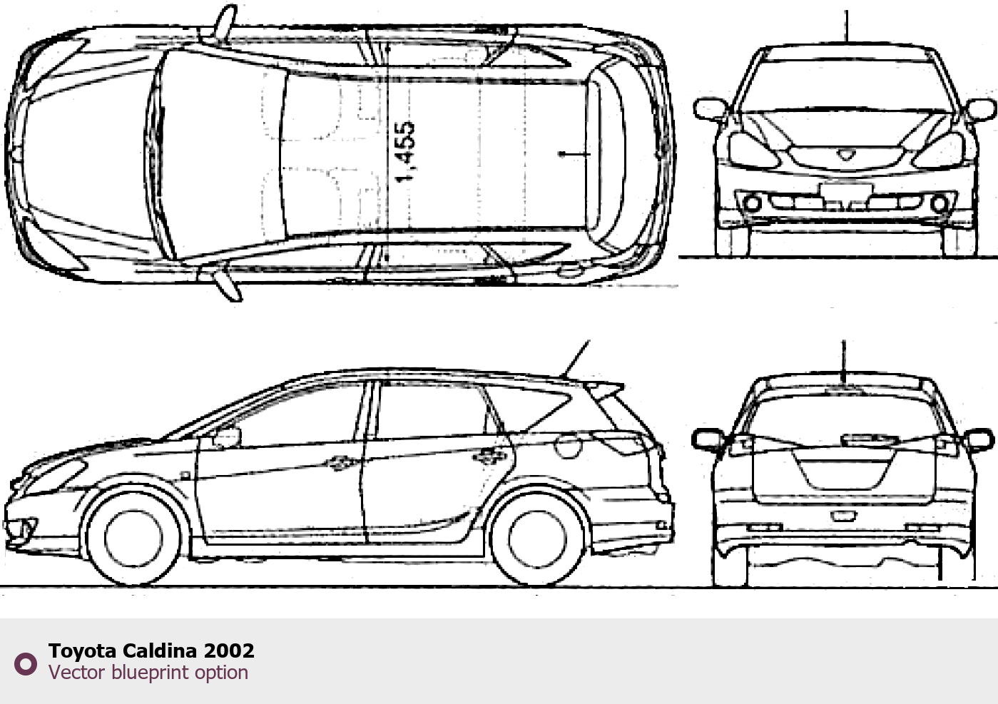 Raster blueprint of the 2002 Toyota Caldina Wagon. This free downloadable image can be used for graphic projects, digital design, and 3D modeling. The file provides accurate exterior proportions of the vehicle. Model year: 2002. Body type: Wagon.