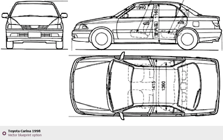 Raster blueprint of the 1998 Toyota Carina Tag. This free downloadable image can be used for graphic projects, digital design, and 3D modeling. The file provides accurate exterior proportions of the vehicle. Model year: 1998. Body type: Tag.
