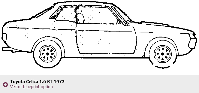 Raster blueprint of the 1972 Toyota Celica 1.6 ST Tag. This free downloadable image can be used for graphic projects, digital design, and 3D modeling. The file provides accurate exterior proportions of the vehicle. Model year: 1972. Body type: Tag.