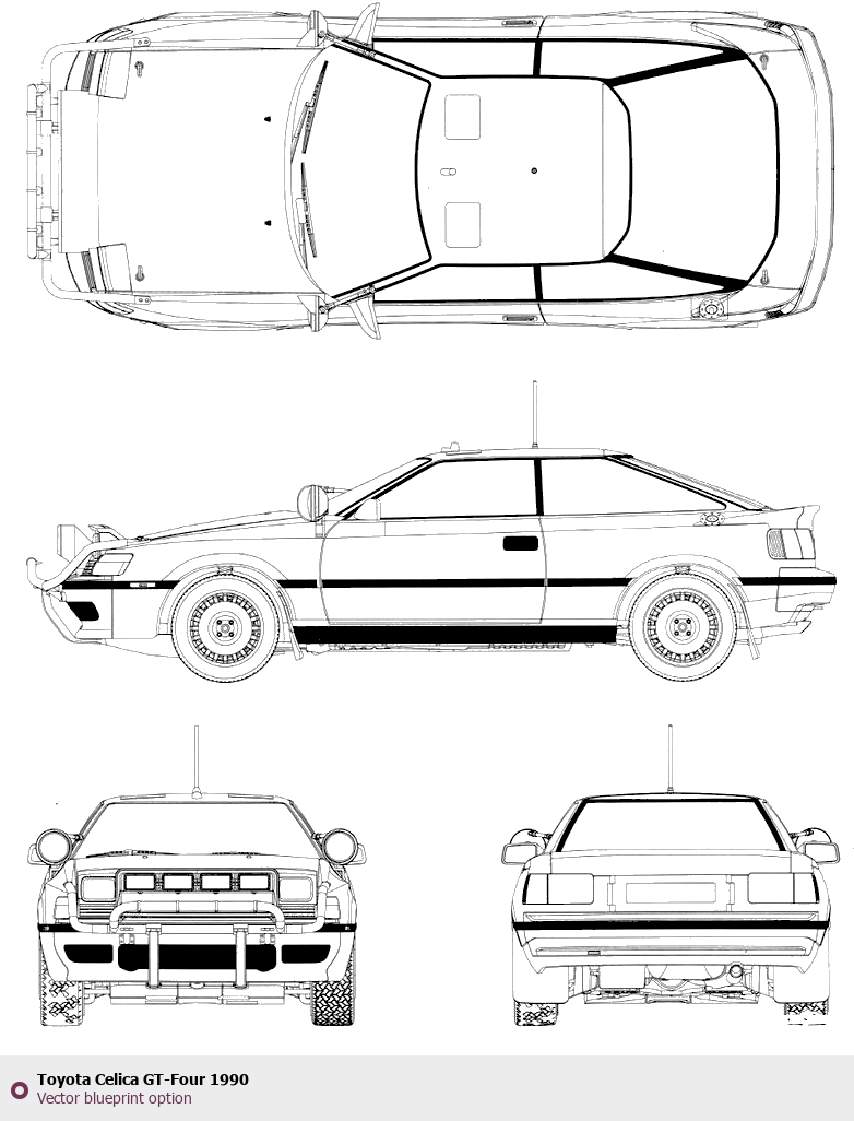 Raster blueprint of the 1990 Toyota Celica GT-Four Tag. This free downloadable image can be used for graphic projects, digital design, and 3D modeling. The file provides accurate exterior proportions of the vehicle. Model year: 1990. Body type: Tag.