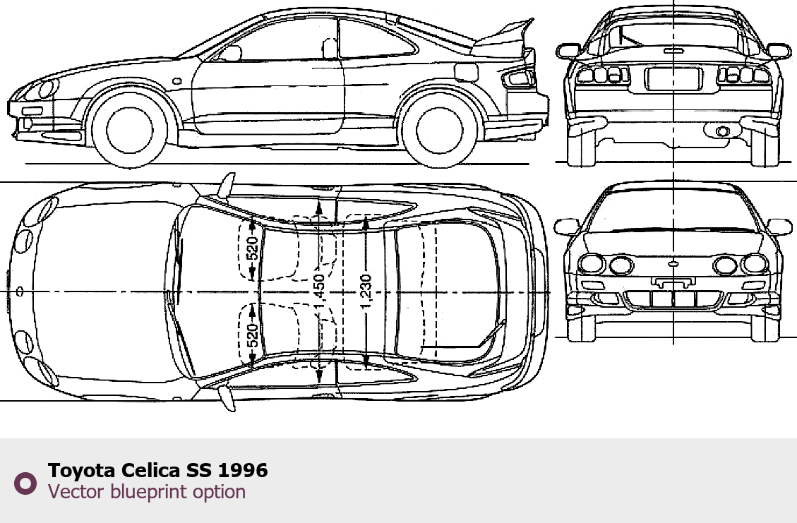 Raster blueprint of the 1996 Toyota Celica SS Tag. This free downloadable image can be used for graphic projects, digital design, and 3D modeling. The file provides accurate exterior proportions of the vehicle. Model year: 1996. Body type: Tag.