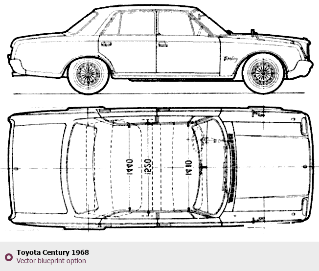 Raster blueprint of the 1968 Toyota Century Limousine. This free downloadable image can be used for graphic projects, digital design, and 3D modeling. The file provides accurate exterior proportions of the vehicle. Model year: 1968. Body type: Limousine.