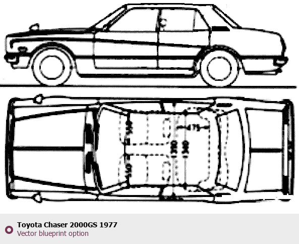 Raster blueprint of the 1977 Toyota Chaser 2000GS Sedan. This free downloadable image can be used for graphic projects, digital design, and 3D modeling. The file provides accurate exterior proportions of the vehicle. Model year: 1977. Body type: Sedan.
