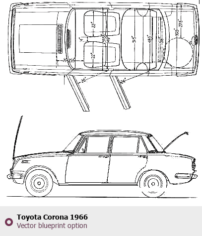 Raster blueprint of the 1966 Toyota Corona Tag. This free downloadable image can be used for graphic projects, digital design, and 3D modeling. The file provides accurate exterior proportions of the vehicle. Model year: 1966. Body type: Tag.