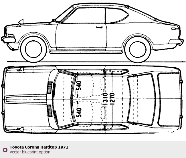 Raster blueprint of the 1971 Toyota Corona Hardtop Tag. This free downloadable image can be used for graphic projects, digital design, and 3D modeling. The file provides accurate exterior proportions of the vehicle. Model year: 1971. Body type: Tag.