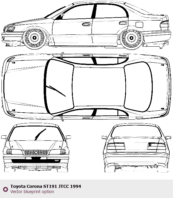Raster blueprint of the 1994 Toyota Corona ST191 JTCC Tag. This free downloadable image can be used for graphic projects, digital design, and 3D modeling. The file provides accurate exterior proportions of the vehicle. Model year: 1994. Body type: Tag.