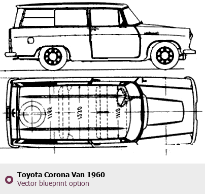 Raster blueprint of the 1960 Toyota Corona Van Van. This free downloadable image can be used for graphic projects, digital design, and 3D modeling. The file provides accurate exterior proportions of the vehicle. Model year: 1960. Body type: Van.
