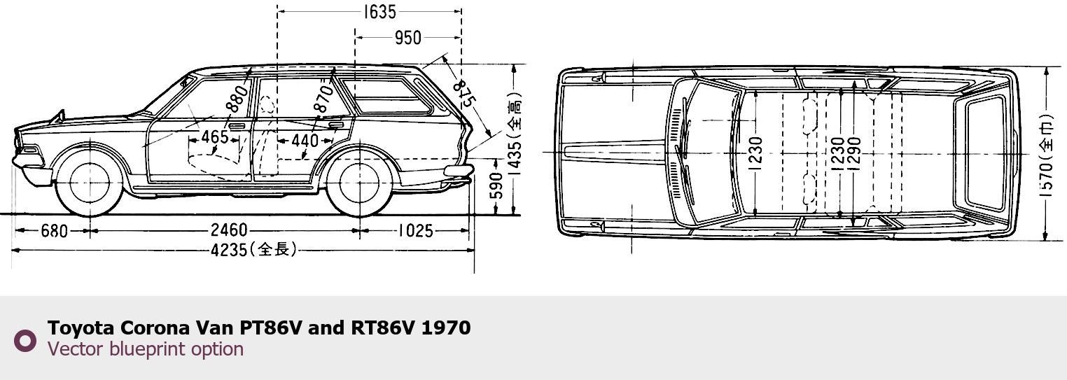 Raster blueprint of the 1970 Toyota Corona Van PT86V and RT86V Van. This free downloadable image can be used for graphic projects, digital design, and 3D modeling. The file provides accurate exterior proportions of the vehicle. Model year: 1970. Body type: Van.