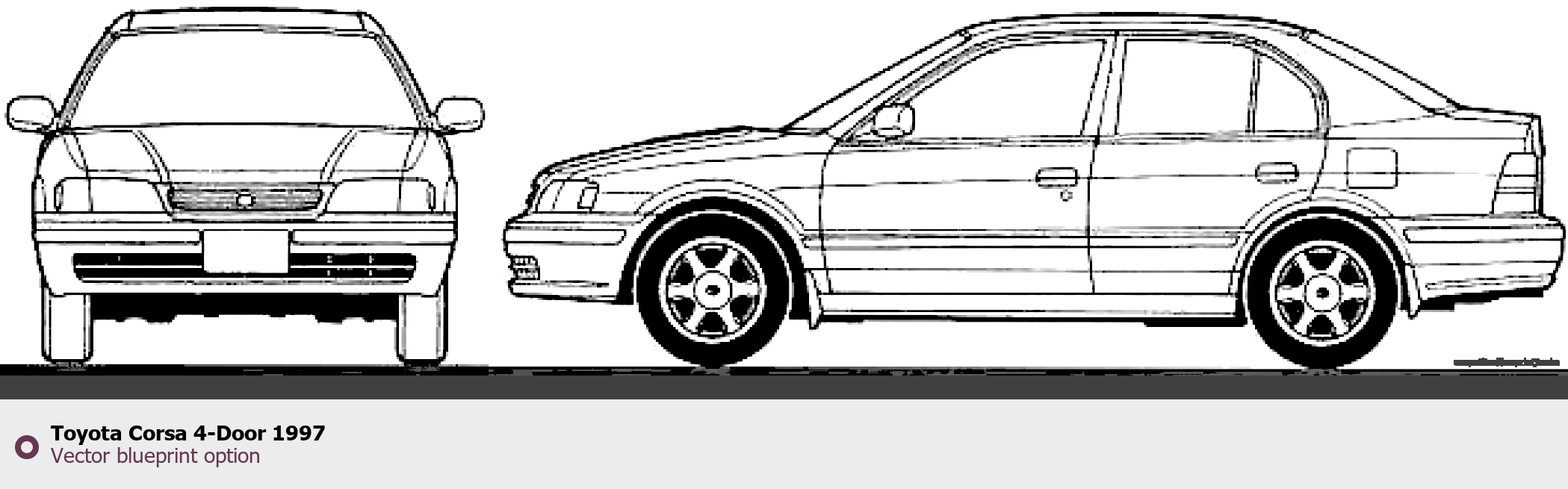 Raster blueprint of the 1997 Toyota Corsa 4-Door Tag. This free downloadable image can be used for graphic projects, digital design, and 3D modeling. The file provides accurate exterior proportions of the vehicle. Model year: 1997. Body type: Tag.