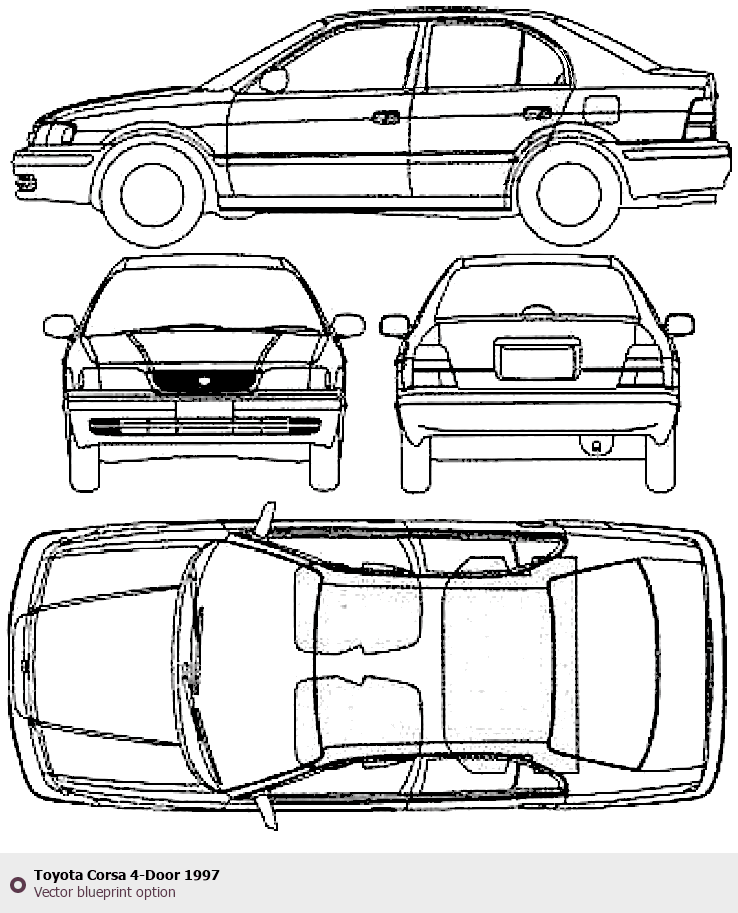 Raster blueprint of the 1997 Toyota Corsa 4-Door Tag. This free downloadable image can be used for graphic projects, digital design, and 3D modeling. The file provides accurate exterior proportions of the vehicle. Model year: 1997. Body type: Tag.