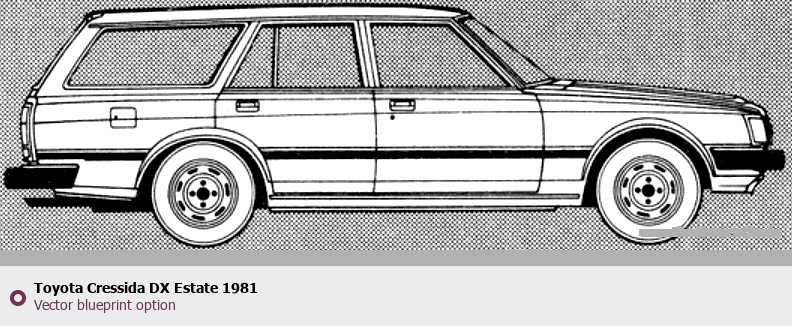 Raster blueprint of the 1981 Toyota Cressida DX Estate Wagon. This free downloadable image can be used for graphic projects, digital design, and 3D modeling. The file provides accurate exterior proportions of the vehicle. Model year: 1981. Body type: Wagon.